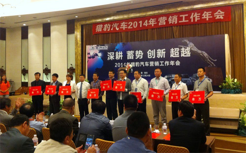 上午9時,會議正式開始。湖南獵豹汽車股份有限公司總經(jīng)理劉康林先生作為廠家領(lǐng)導(dǎo)代表致歡迎詞,獵豹汽車總經(jīng)理助理姚志輝先生對2013年工作總結(jié)及2014年的工作思路進行匯報。“2013年優(yōu)秀經(jīng)銷商頒獎”環(huán)節(jié)中,慶陽唫菱汽車銷售服務(wù)有限公司榮登獵豹汽車光榮榜,榮獲“皮卡年度新秀獎”,同時獲得廠家獎勵獎金三萬元,慶陽唫菱王東經(jīng)理作為公司代表上臺領(lǐng)獎,獵豹汽車銷售部部長雷軍峰先生為其頒發(fā)了榮譽證書及獎金。