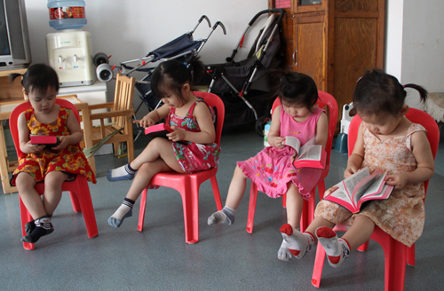 看到爸爸媽媽們到來,這些只有兩三歲的小蘿莉們高興壞了,他們的表演欲劇增。一會(huì)兒唱歌,一會(huì)兒跳舞,還像模像樣地看書來,小耀耀鉆進(jìn)萬華媽媽的懷抱開心地不肯離開?吹竭@些遭遇不幸孩子們健康地成長(zhǎng),大家心里充滿安慰。
