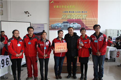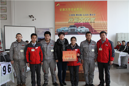 (董事會辦公室 盛玉卿)掌聲送給汽車公司一線崗位學(xué)習(xí)和戰(zhàn)斗著的同事們!2014年12月26日下午,由甘肅萬華汽車監(jiān)事會、萬華人資公司共同主辦的“2014年汽車公司‘技能大比武’”在甘肅萬華進口三菱展廳成功舉辦。6家汽車公司通過抽簽選出的36名參賽選手參加了此次比賽。經(jīng)過兩個半小時的激烈角逐,萬華金盛隊以團體163分的總成績大比分奪冠。而隨著現(xiàn)場個人參賽成績統(tǒng)計結(jié)果的揭曉,萬華金盛售后服務(wù)經(jīng)理李惠萍榮獲個人總分第一,使得萬華金盛毫無懸念地成為本屆“技能比武”中的大贏家。