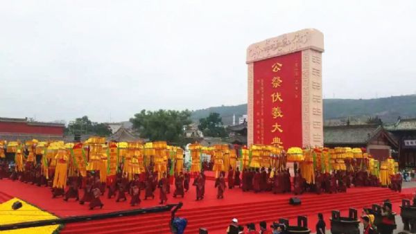 6月22日上午,由國務(wù)院港澳事務(wù)辦公室、國務(wù)院臺灣事務(wù)辦公室、中國僑聯(lián)和甘肅省人民政府主辦,甘肅省文化廳、天水市人民政府承辦的2015(乙未)年公祭中華人文始祖伏羲大典在天水市伏羲廣場隆重舉行。全國政協(xié)副主席馬飚宣布公祭伏羲大典開始。中國國民黨榮譽副主席蔣孝嚴(yán)、甘肅省人民政府省長劉偉平、甘肅省政協(xié)主席馮健身等出席。此次大典的主題為“同根同祖 中華共祭”,海內(nèi)外華夏兒女匯聚羲皇故里,感懷伏羲功績、傳承中華文明,表達對伏羲的虔誠敬仰。