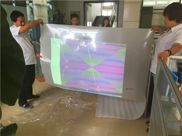 盡管沒有專門的調(diào)試場(chǎng)所,公司員工在集團(tuán)二樓的過道、走廊架起了投影機(jī),拉起了調(diào)光膜,對(duì)其進(jìn)行一遍又一遍的調(diào)試。因?yàn)檎{(diào)光膜是新型產(chǎn)品,所以在沒有實(shí)驗(yàn)以前不知道會(huì)有什么樣的效果,這就需要工作人員對(duì)其進(jìn)行反復(fù)的實(shí)驗(yàn),確保投影畫面達(dá)到最清晰的效果,給客戶一個(gè)滿意的答復(fù)。