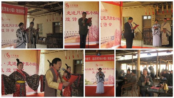 敦煌市文聯(lián)副主席、作協(xié)主席李茂錦和千年敦煌·月牙泉小鎮(zhèn)商戶協(xié)會會長劉軍先生依次致辭。李茂錦先生的詩作《四月,詩情飛揚的季節(jié)》在美妙的吟誦中,拉開了“相約春天·走進月牙泉小鎮(zhèn)”敦煌詩會的序幕。敦煌市書法家協(xié)會副主席傅有宏先生吟誦的詩作《我愛你,千年敦煌》鏗鏘有力,聲音渾厚,贏得現(xiàn)場陣陣掌聲。
