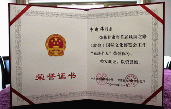 近日,首屆絲綢之路(敦煌)國(guó)際文化博覽會(huì)總結(jié)表彰大會(huì)在敦煌大劇院召開(kāi)。會(huì)議表彰了首屆文博會(huì)工作中敦煌市涌現(xiàn)出來(lái)的50個(gè)先進(jìn)集體、160名先進(jìn)個(gè)人,以及1300多名群防群治工作先進(jìn)個(gè)人。敦煌千年古城開(kāi)發(fā)有限公司董事長(zhǎng)牛新偉榮獲“先進(jìn)個(gè)人”榮譽(yù)稱號(hào)。