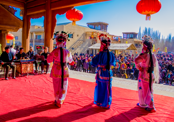 中午1時30分,月牙泉小鎮(zhèn)人山人海,萬人空巷。秦腔折子戲、敦煌曲子戲等多種劇目在景區(qū)戲樓處輪番上演,現(xiàn)場異彩紛呈,戲曲表演者以優(yōu)美的唱腔、獨(dú)特的韻白、別致的風(fēng)姿得到萬名戲迷的陣陣掌聲和喝彩聲。