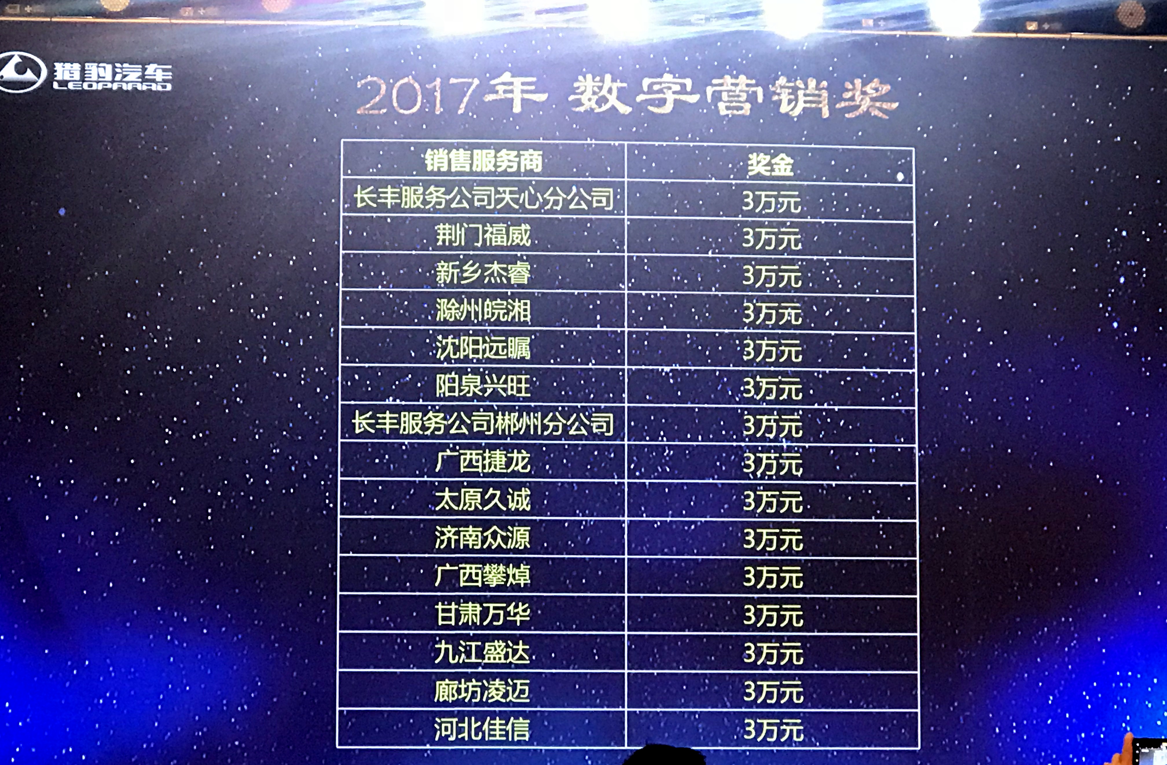 1月18日,湖南獵豹汽車股份有限公司“新時(shí)代,新跨越,共贏2018”獵豹汽車2018年?duì)I銷工作年會(huì)在長(zhǎng)沙世紀(jì)金源大飯店隆重舉行。甘肅萬華實(shí)業(yè)集團(tuán)有限公司副總經(jīng)理宿曉中、甘肅萬華金盛汽車銷售服務(wù)有限公司銷售經(jīng)理陳振中應(yīng)邀出席此次營(yíng)銷工作年會(huì)。會(huì)上,萬華金盛憑借優(yōu)秀的營(yíng)銷能力榮獲“2017年度數(shù)字營(yíng)銷優(yōu)秀獎(jiǎng)”。