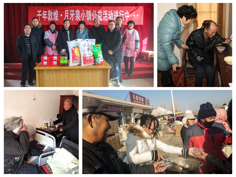 在陽關(guān)老年公寓,千年敦煌·月牙泉小鎮(zhèn)項目總監(jiān)熊秀霞和客房運營管理中心運營總監(jiān)郭龍帶著盛好的粥來到行動不便的老人身邊,熱情地說道:“今天是臘八節(jié),月牙泉小鎮(zhèn)來給你們送臘八粥了!過完臘八就是年,提前祝你們新年快樂!”老人們聽到后,眼含淚光,有的擦拭著眼角,喃喃地說:“是熱的,謝謝,謝謝……”