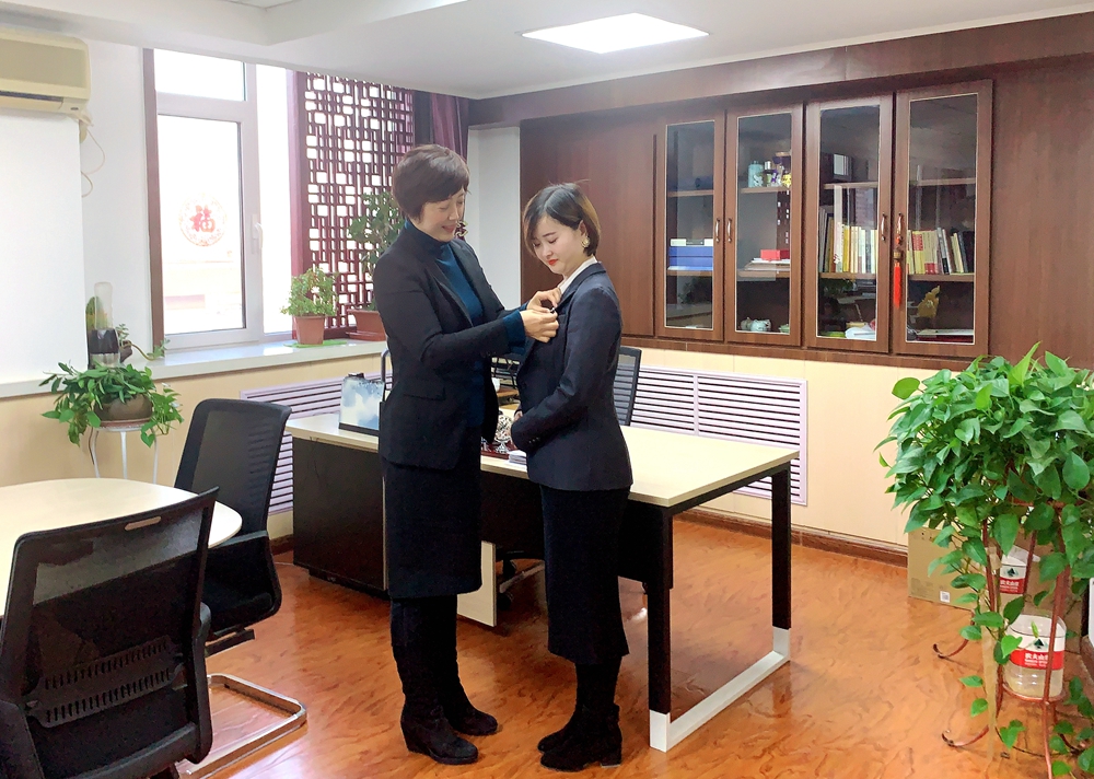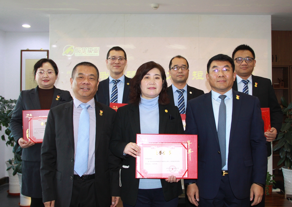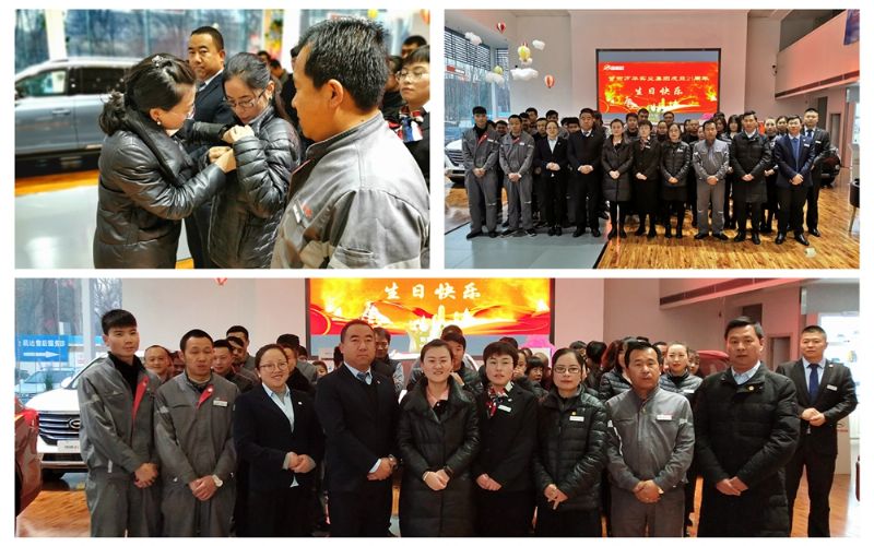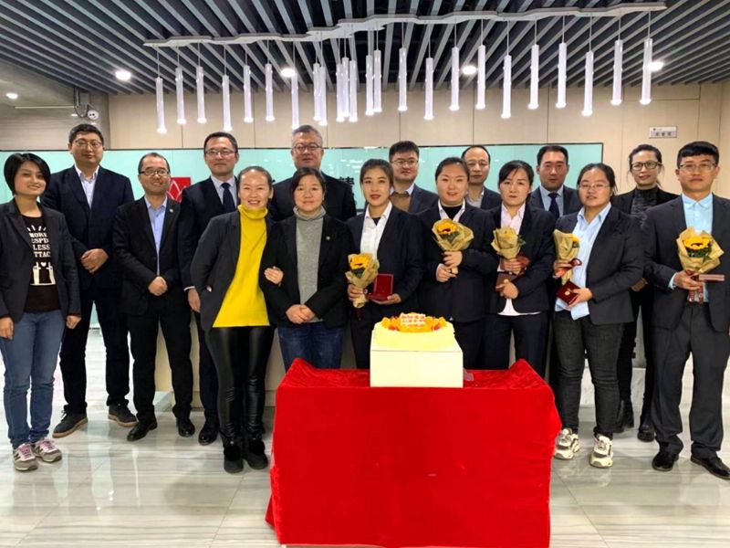 青海金易達(dá)總經(jīng)理丁云艷為司齡新晉5年和10年老員工佩戴金銀徽章,與全體員工共同送出對(duì)萬華21歲生日的祝福
