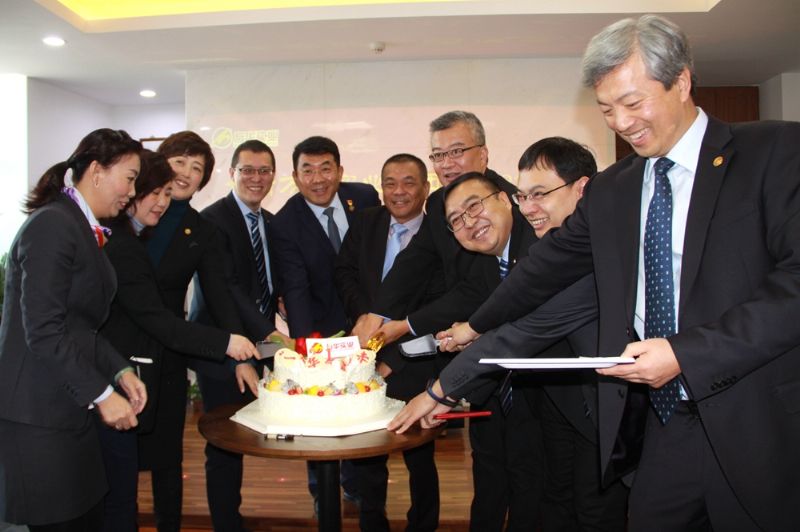 萬華金慧總經(jīng)理施強(qiáng),監(jiān)事會(huì)主席陳永華,董事會(huì)秘書王鑫,副總經(jīng)理張育民與新晉司齡5年和10年的老員工授勛合影,分享生日蛋糕共慶萬華21周年