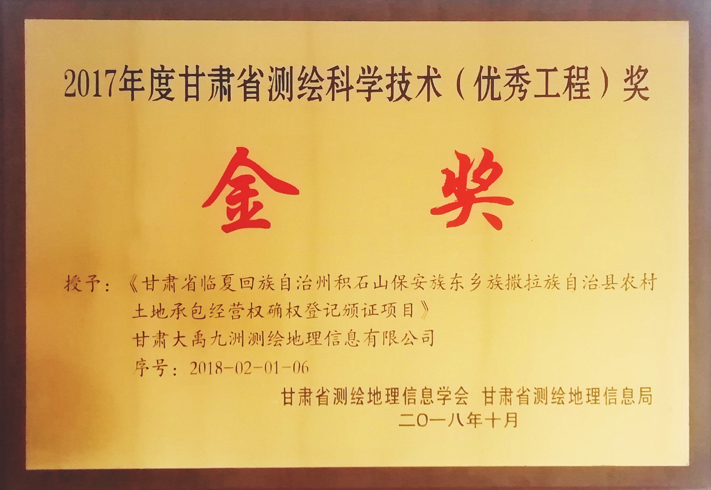 2017年度甘肅省測繪科學(xué)技術(shù)(優(yōu)秀工程)獎-金獎